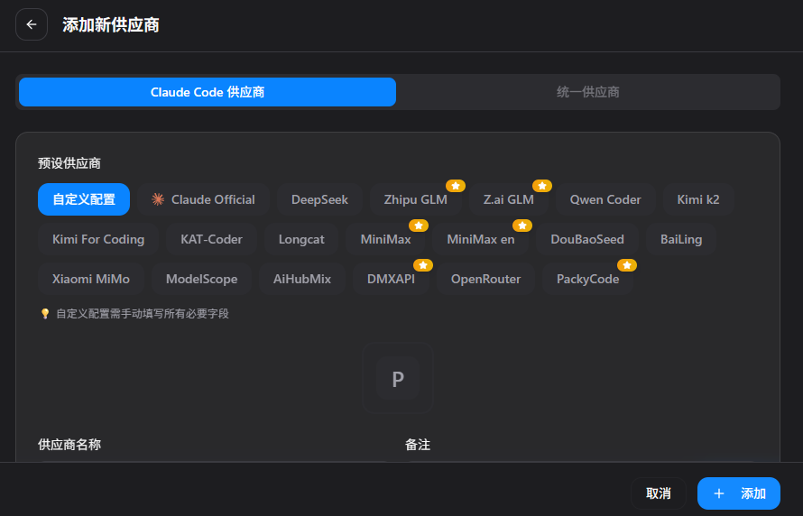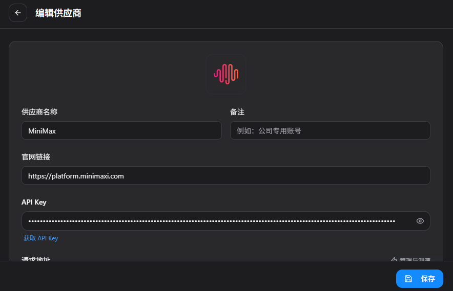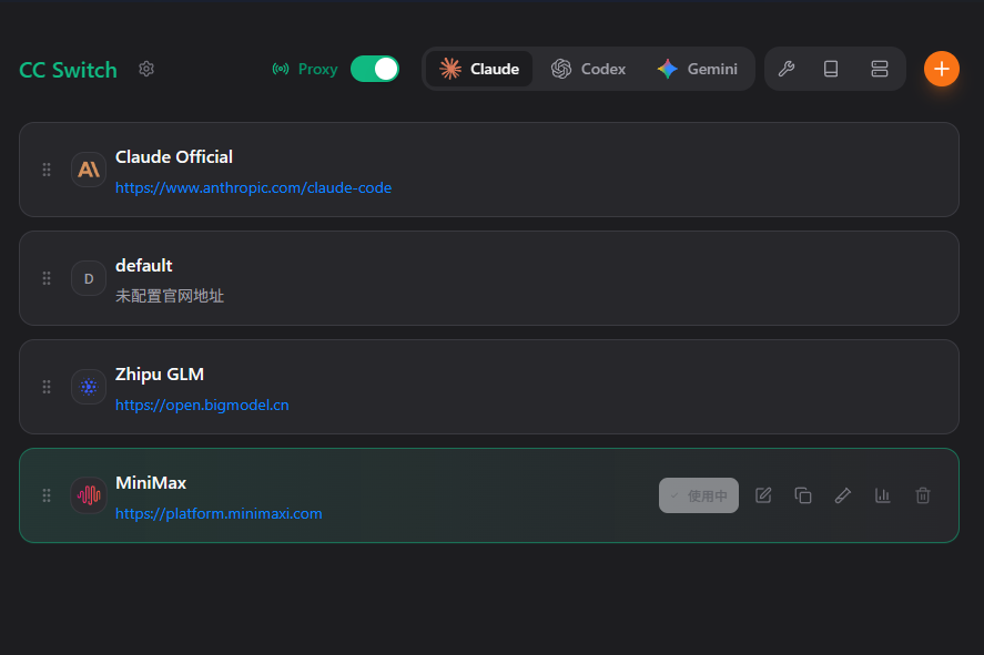 When you select a provider—say, Minimax—CC-Switch pre-fills basic information. You just need to add: