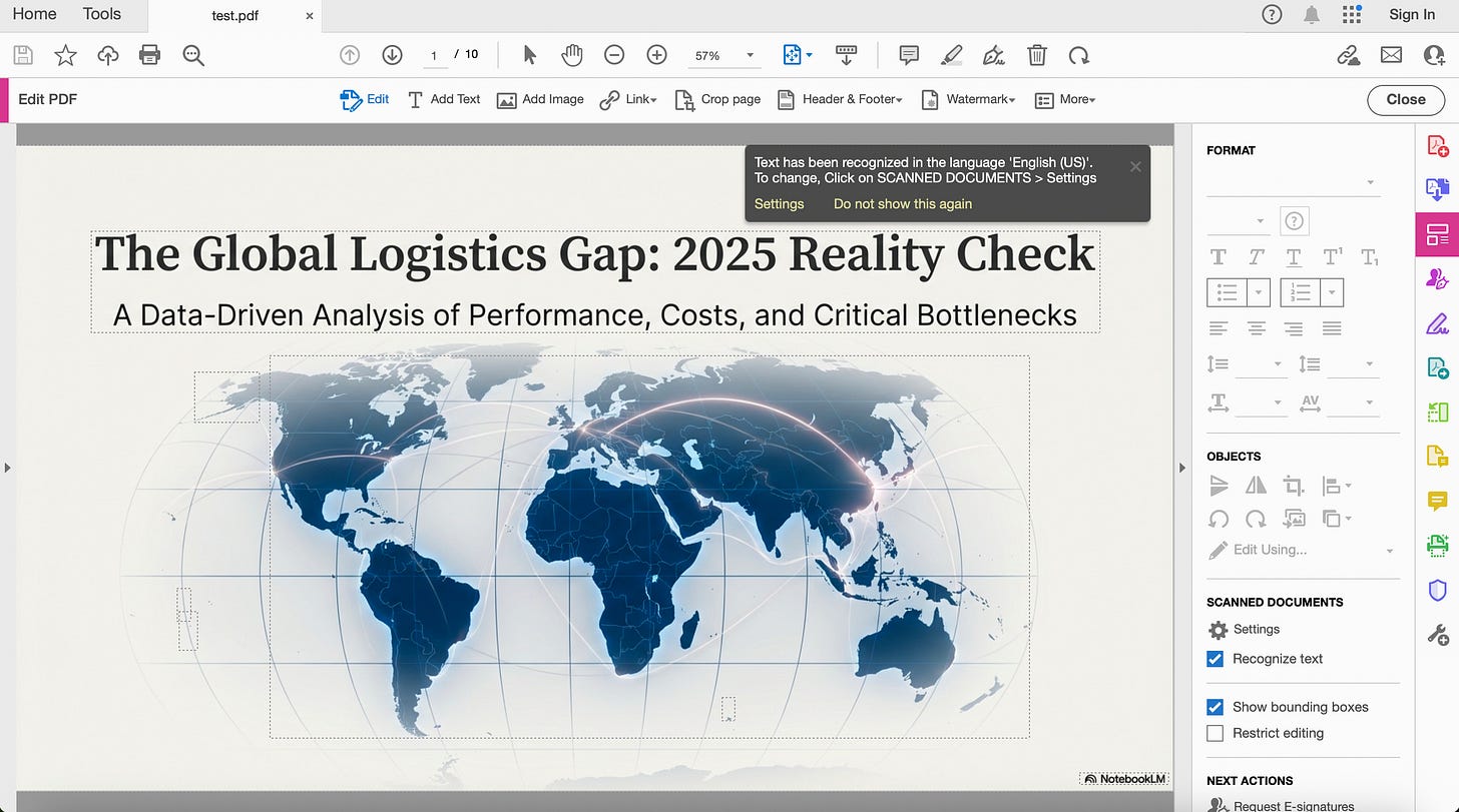 Sometimes Acrobat groups text + background image as a single locked object. You can’t decouple them. This is most common with slides that mix data visualization backgrounds with overlaid labels. But honestly, this approach resolves 90%+ of typical editing needs.