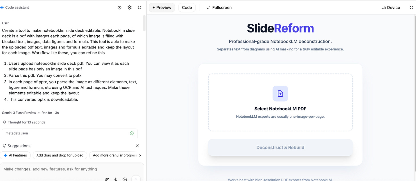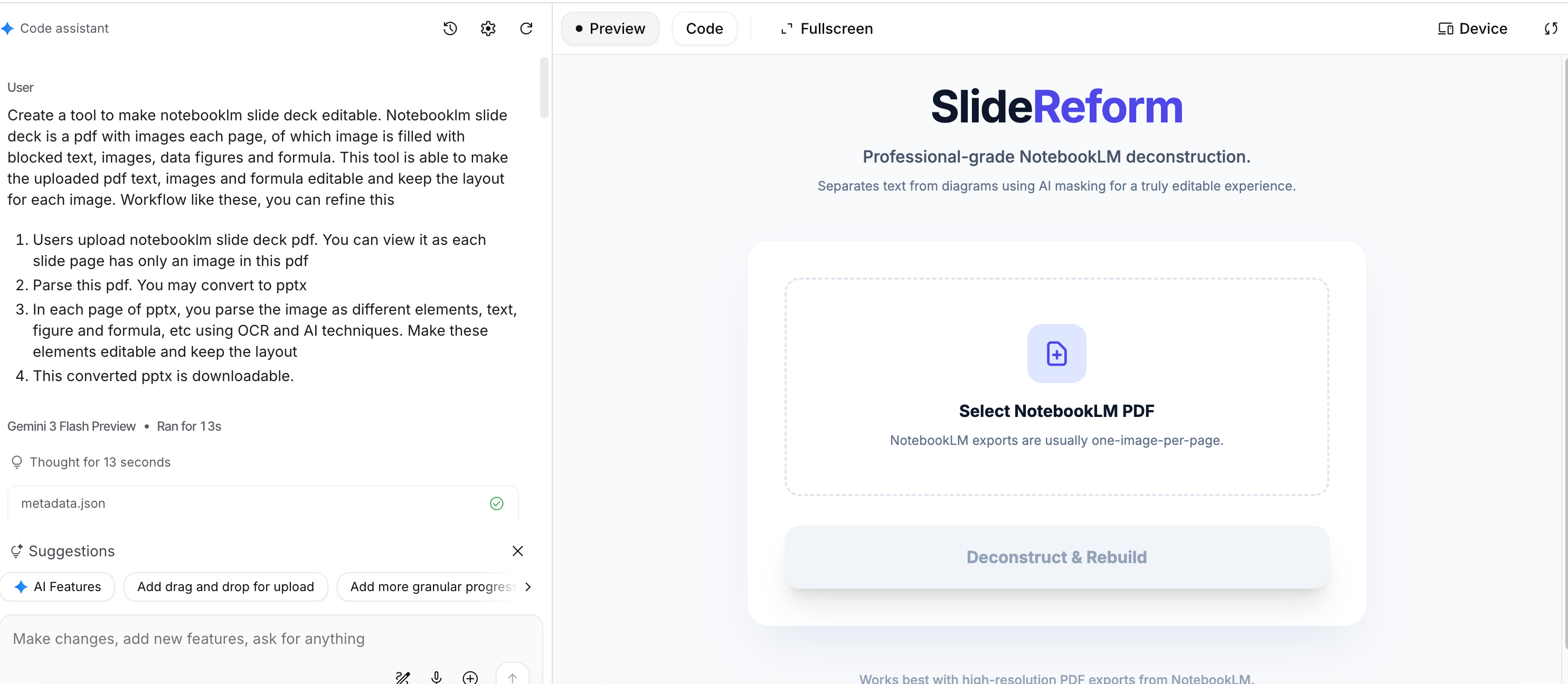 I used Google AI Studio with Vibe Coding to build something I called SlideReform. The workflow breaks down like this: