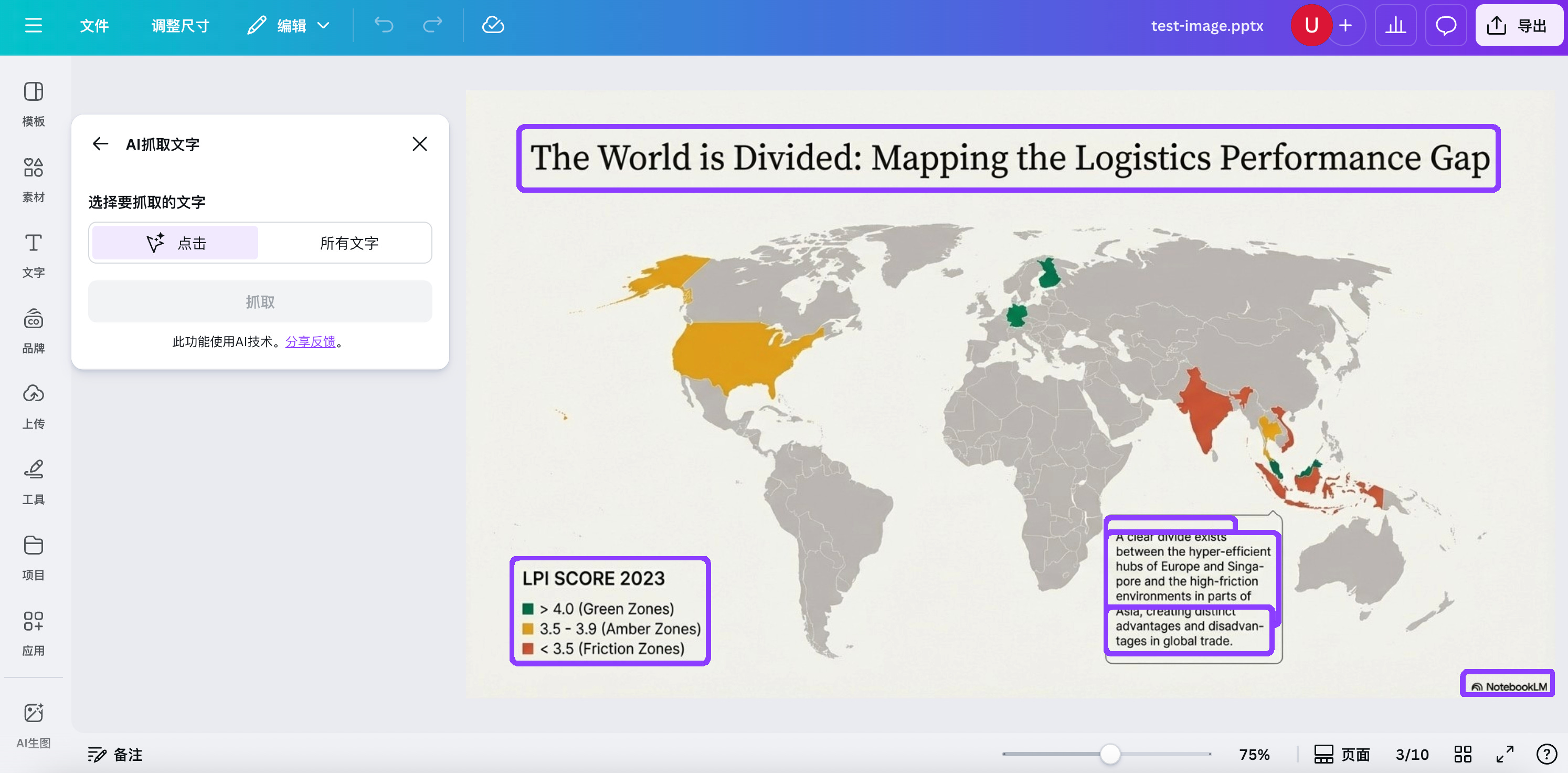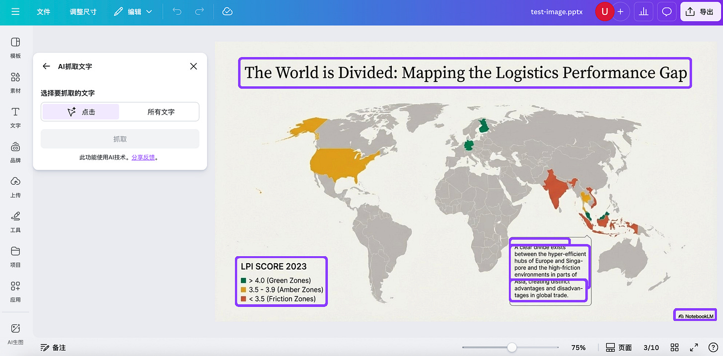 AI Extract Text — Canva scans the slide with vision AI and identifies all text blocks. You can then select extracted text and edit it as native text (not an image). The font and formatting shift slightly, but it’s editable.